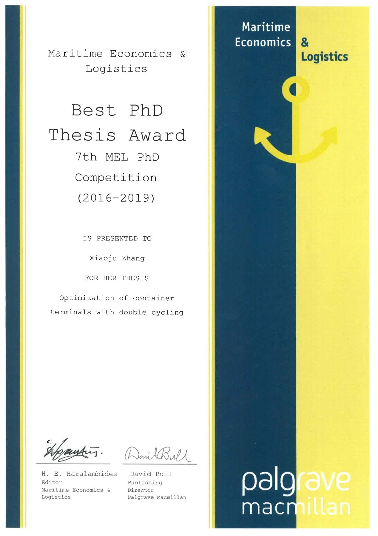 第七届MELMaritime Economics & Logistics)优秀博士论文评选会议于2019621日在意大利热那亚举行,本次会议由航运领域旗舰期刊MEL主办,IAMEInternational Association of Maritime Economists)和热那亚大学承办,IAME主席Thanos Pallis教授、MEL主编Hercules E. Haralambides教授、热那亚大学Francesco Parola教授及热那亚港口局等人员出席了会议。会议每三年召开一次,至今已举办二十余年,受到了来自全球上千位博士毕业生的关注,会议评选出了2016-2019年航运经济物流领域取得博士学位的优秀博士论文,并对最佳、第二、第三名优秀博士论文获得者予以表彰,对航运领域的研究有重要意义。
