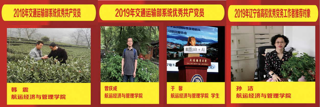 此外,会上还对学校2017-2019年党建成果进行了回顾。其中,韩震教授被评为2018年交通运输部系统“优秀共产党员”,曾庆成院长、2018级研究生于馨被评为2019年交通运输部系统“优秀共产党员”、孙洁老师被评为2019年辽宁省高校“优秀党务工作者”推荐对象。