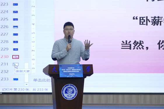 大赛指导教师崔安迪老师为同学们带来了专业化的导向,分享了自己在指导学生职业规划过程中的经验和心得。崔老师先是为大家介绍了职业生涯规划大赛的基本信息与参赛方式,以及如何做好前期的材料准备,然后他强调了职业理想与情怀升华的重要性,崔老师最后还为大家讲解了不同类型的行业,不仅为同学们提供了宝贵的职业规划建议,也表达了对同学们未来职业生涯的鼓励与期许。