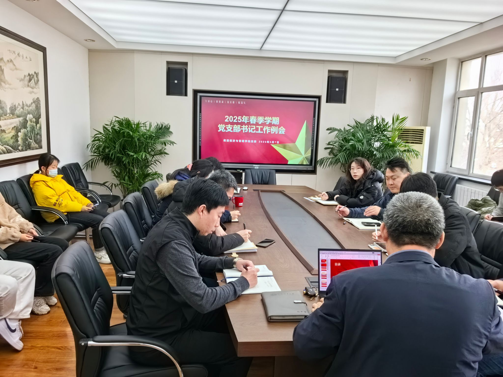 在管理楼B座413A会议室召开2025年春季学期党支部书记工作例会,会议由学院党委书记张罕育主持,全体党支部书记参会。