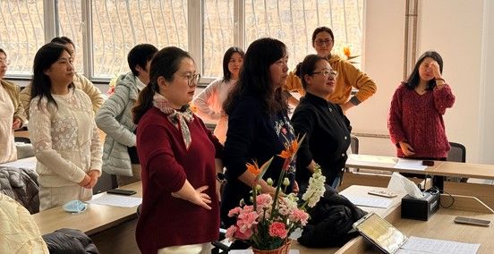为了让女教师们更熟练地运用发声技巧,刘老师提议一起合唱一首经典歌曲《世界赠予我的》。刘老师站在前方,一边打着节拍,一边引导大家运用刚刚学到的呼吸和共鸣技巧来唱歌。在演唱过程中,她不断提醒大家注意气息的控制,保持声音的平稳与连贯,感受共鸣在身体里产生的奇妙振动。随着歌声的推进,女教师们越来越投入,原本参差不齐的声音变得和谐统一,歌声也越发悠扬动听。一曲唱罢,现场响起热烈的掌声,大家脸上洋溢着自信与欢乐。