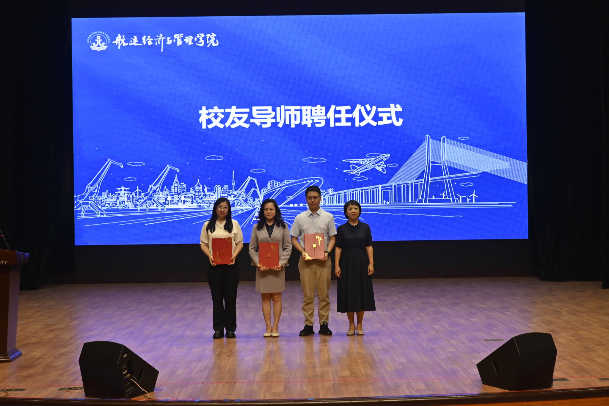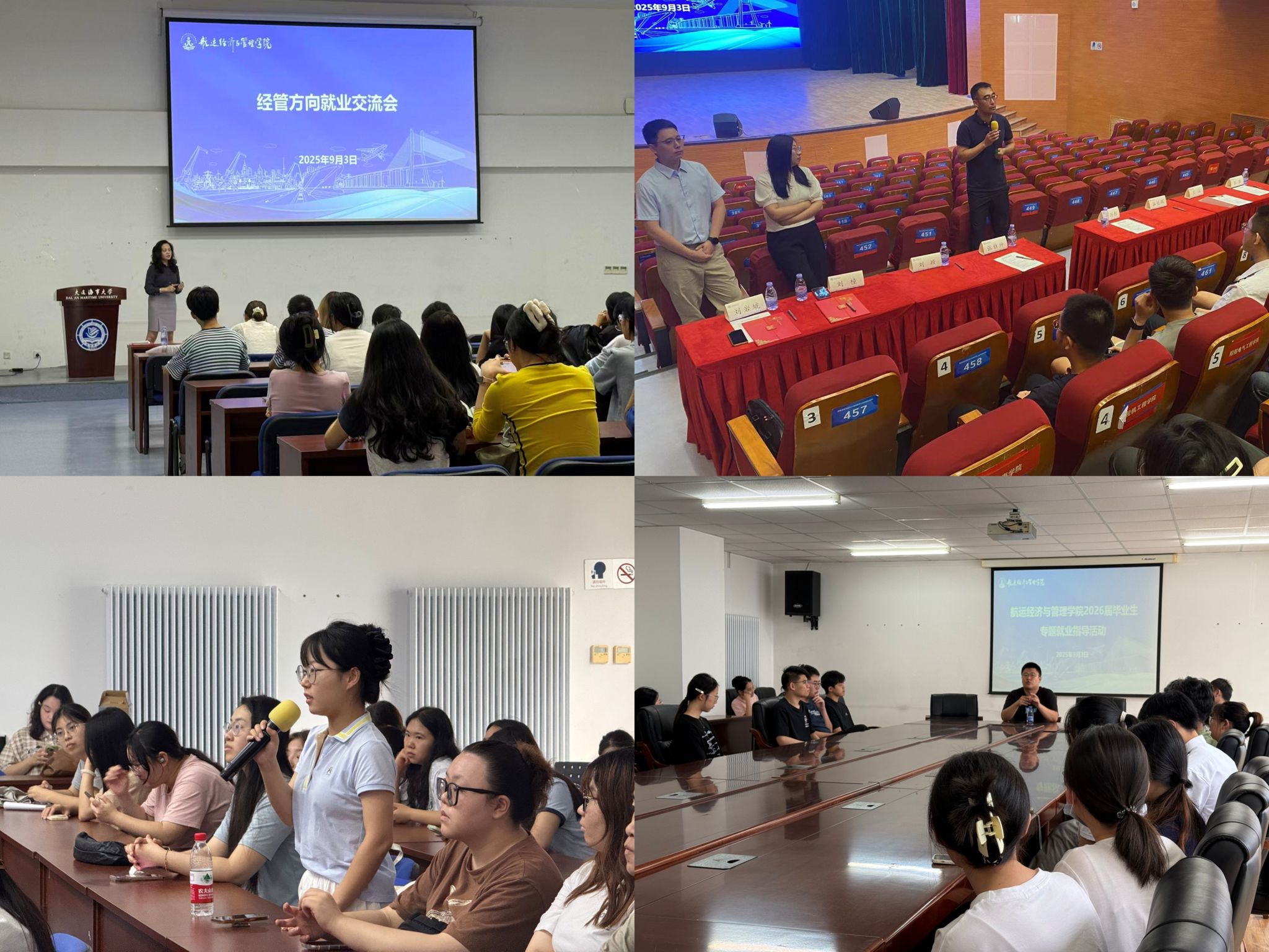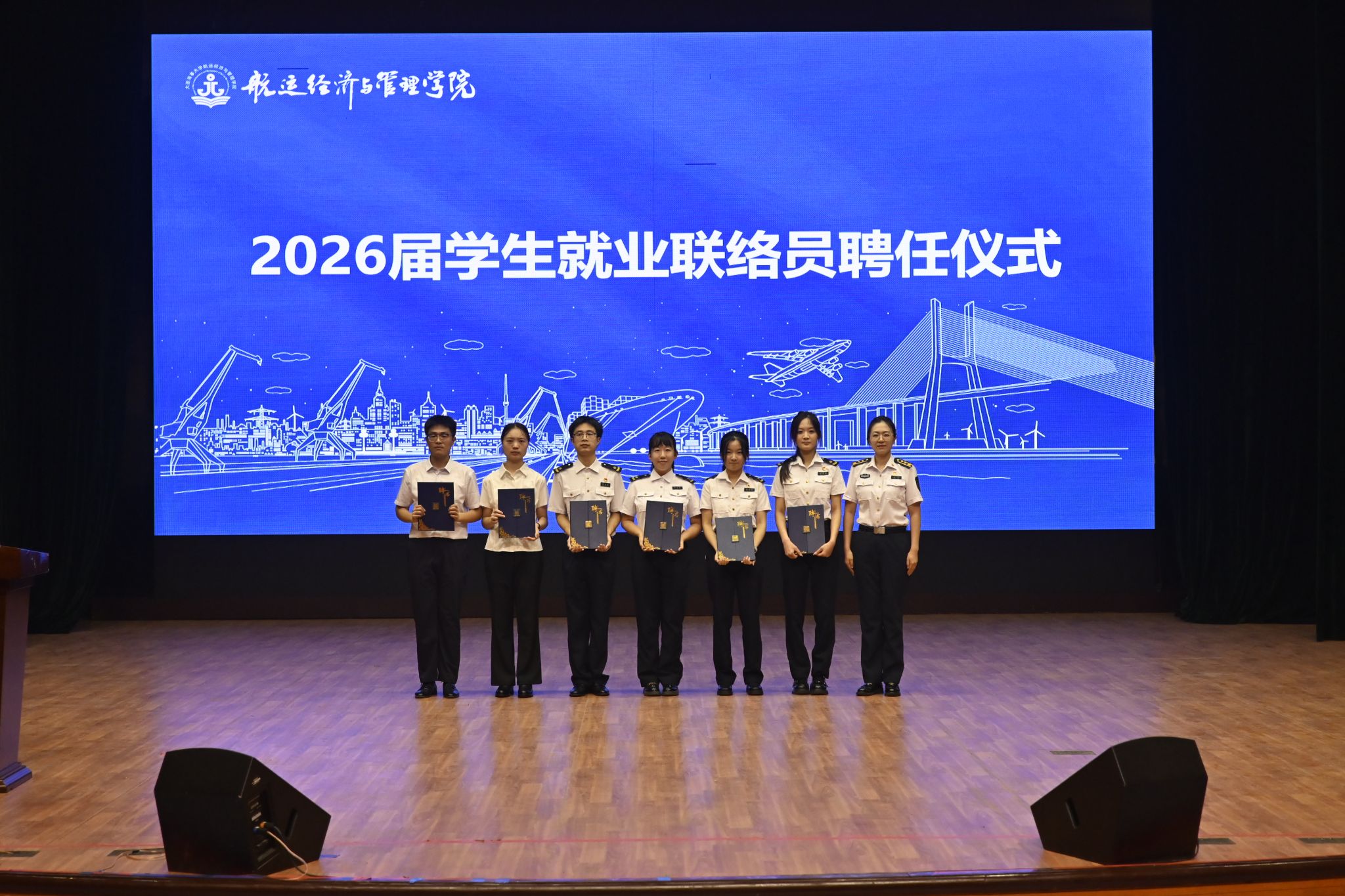 全体领导班子王征、谷艳辉、何剑彤、马鹤丹、王岑,学校校友事务与学生就业处副处长苏萍,中国外运东北有限公司副总经理、校友张雅帅,招商银行大连分行人力资源部总经理、校友刘颖,大连港集发物流有限责任公司薪酬福利高级专员、校友刘橦,大连中远海运恒昇海物流有限公司船务部、校友刘岩虓,学院专业(大类)负责人匡海波、孟斌、谭小芳、韩兵,系主任白丹宇、李朝辉,教师党支部书记程海燕、片锋,学院全体指导员及2026届毕业生参会。
