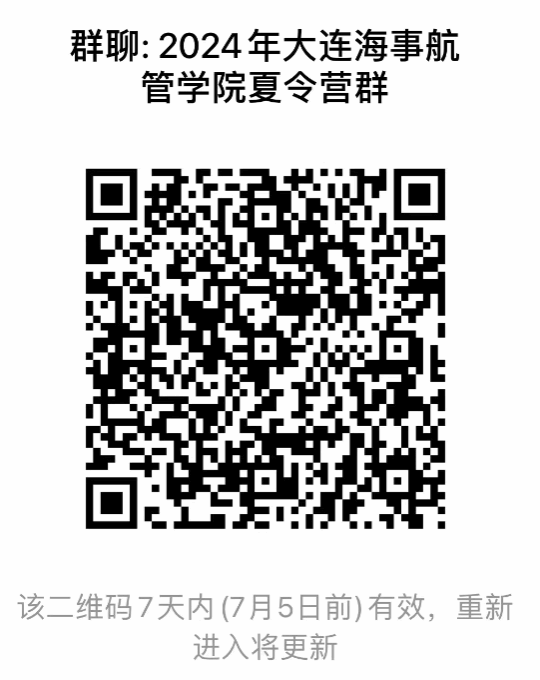 2024年优秀大学生学术夏令营入营名单进行公示(详见附件)。 请名单中的营员于2024年6月29日下午15点前通过扫码加入“2024年大连海事航管学院夏令营群”并在群中通过接龙的方式确认是否能够按时入营以及是否需要安排住宿,逾期未入群确认的视为自动放弃入营资格。入营的营员请及时关注群消息,夏令营活动具体安排将在夏令营活动群通知。