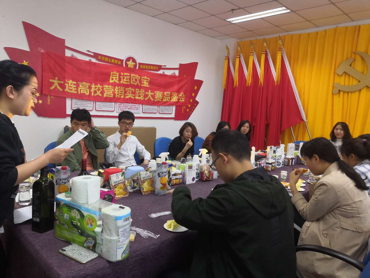 为了使参赛队伍成员更好了解产品,大连良运欧宝佳源商贸有限公司的员工代表为参赛学生主讲各类参赛主打产品的营销特性及竞争优势,包括儿童食品、进口饮料、洗护用品等多个类别。会间,焉洪基指导员页点明本次活动的主旨,并希望同学们积极参与此次比赛,学以致用、敢于实践,并预祝我校参赛学生能取得一个好成绩。