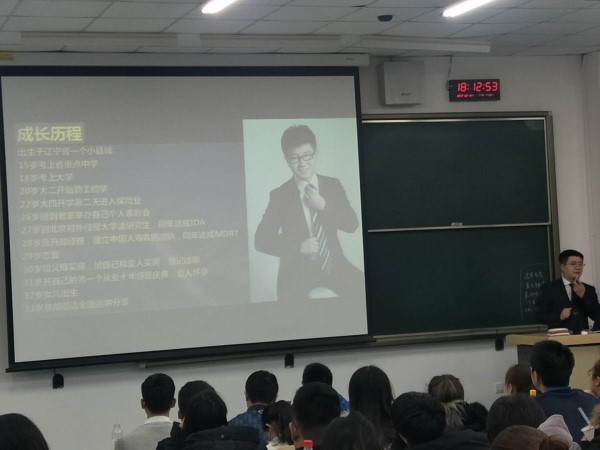 在宣讲环节,张晓远先生首先进行了自我介绍并分享了他进行职业探索、创建团队的经验。随后,张晓远在分享环节强调了“每一位创业者都有一颗不平凡的心”以及找到一份真正热爱的工作的重要性,为在场的同学分享了自己内心的想法和经验。紧接着,由犇腾团队成员王首骏先生进行宣讲。王首骏先生为大家分享了自己的一些宝贵经验并且对中国人寿“蓝海·参天计划”进行了简要的介绍。另外,王守骏强调:大学生应该提早对自己未来的职业生涯进行规划,这样可以减少面临毕业就业时的恐慌与盲目。