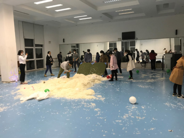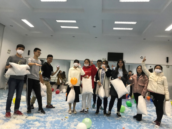 本次活动首先由心理委员进行微信平台推送的编辑,由同学们进行线上报名。大家都非常积极,报名人数远超预期。本场特色团训由心理委员担任主持人,活动开始,心理委员首先向大家强调了活动规则及安全事项,之后大家便开始一起做游戏项目,陆续进行“集中火力”“穿越隧道”“大象鼻子”“大混战”,通过摔打枕头,摔出满地的羽毛,以体力运动的方式释放和宣泄自己的压力,在摔打中找到乐趣,增进彼此之间的感情。每个人脸上都挂着笑容,从脸上就看得出来同学们的释放。最后大家围坐在羽毛旁分享了自己刚才的乐趣与收获。气氛非常热烈!